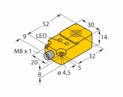TURCK INDUCTIVE SENSOR RECTANGULAR height 14mm, active face on top, DC 3-wire,8.6...30VDC, N/O, 10mm SENSING, M8 CONNECTOR